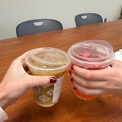 11:00 a.m.: After class, I usually like to find a friend to get coffee with because there is a short window between my class and lunch. Today, I am walking to Starbucks with one of my Theta friends.