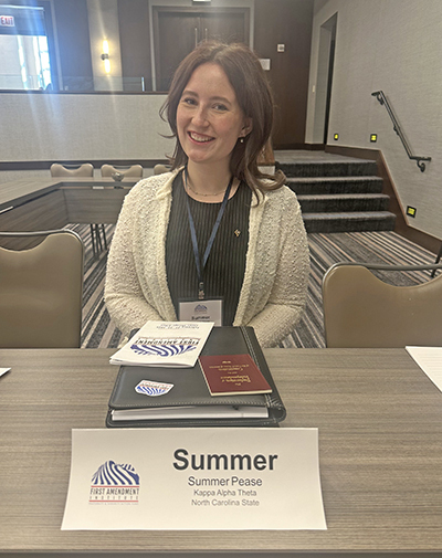 Summer Pease, Theta Theta/NC State, attended the First Amendment Institute to better understand the First Amendment's relation to colleges and students in Greek life.” I wanted to learn about what protects Theta and where people could infringe upon it. I love Kappa Alpha Theta through and through and would hate to see something happen to my chapter only because we were not fully educated on our rights.” She plans to speak up at upcoming chapter meetings and future Panhellenic and campus meetings to share what she’s learned.